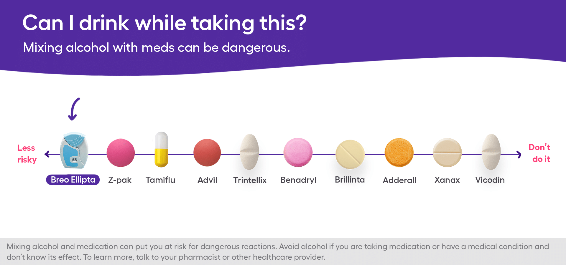 There are no direct interactions between alcohol and Breo Ellipta. Occasional consumption of alcohol should be fine while using Breo Ellipta as prescribed. But it’s important to check with your healthcare provider before doing so. Alcohol can also worsen symptoms of asthma or COPD, so it’s best to get medical advice. Certain people, especially those with high blood pressure, heart problems, diabetes, or liver problems, should use caution when mixing alcohol and Breo Ellipta.