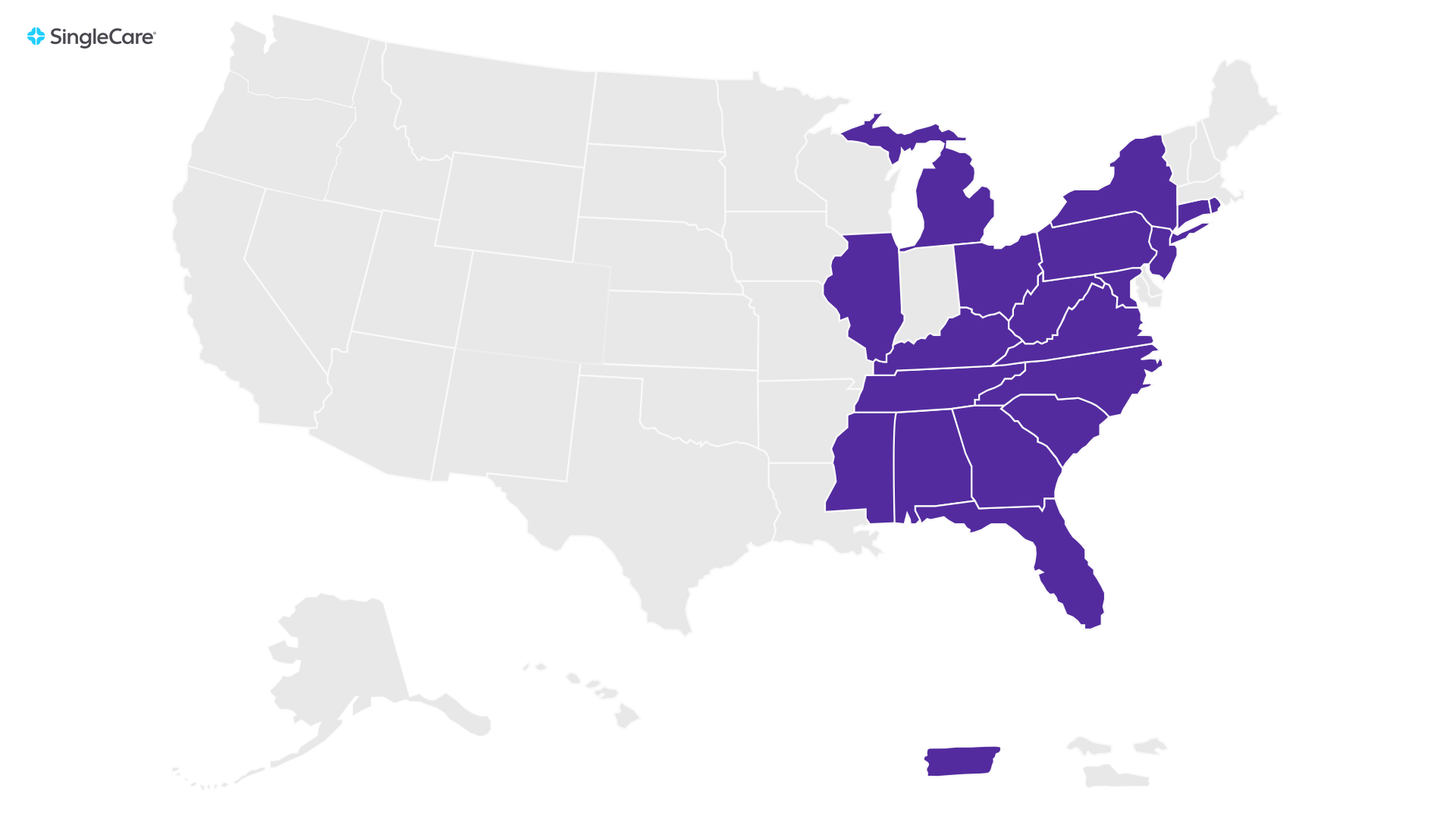 (Alabama, Connecticut, Washington, D.C., Florida, Georgia, Illinois, Kentucky, Maryland, Minnesota, North Carolina, New Jersey, New York, Ohio, Pennsylvania, Puerto Rico, Rhode Island, South Carolina, Tennessee, Virginia, and West Virginia)