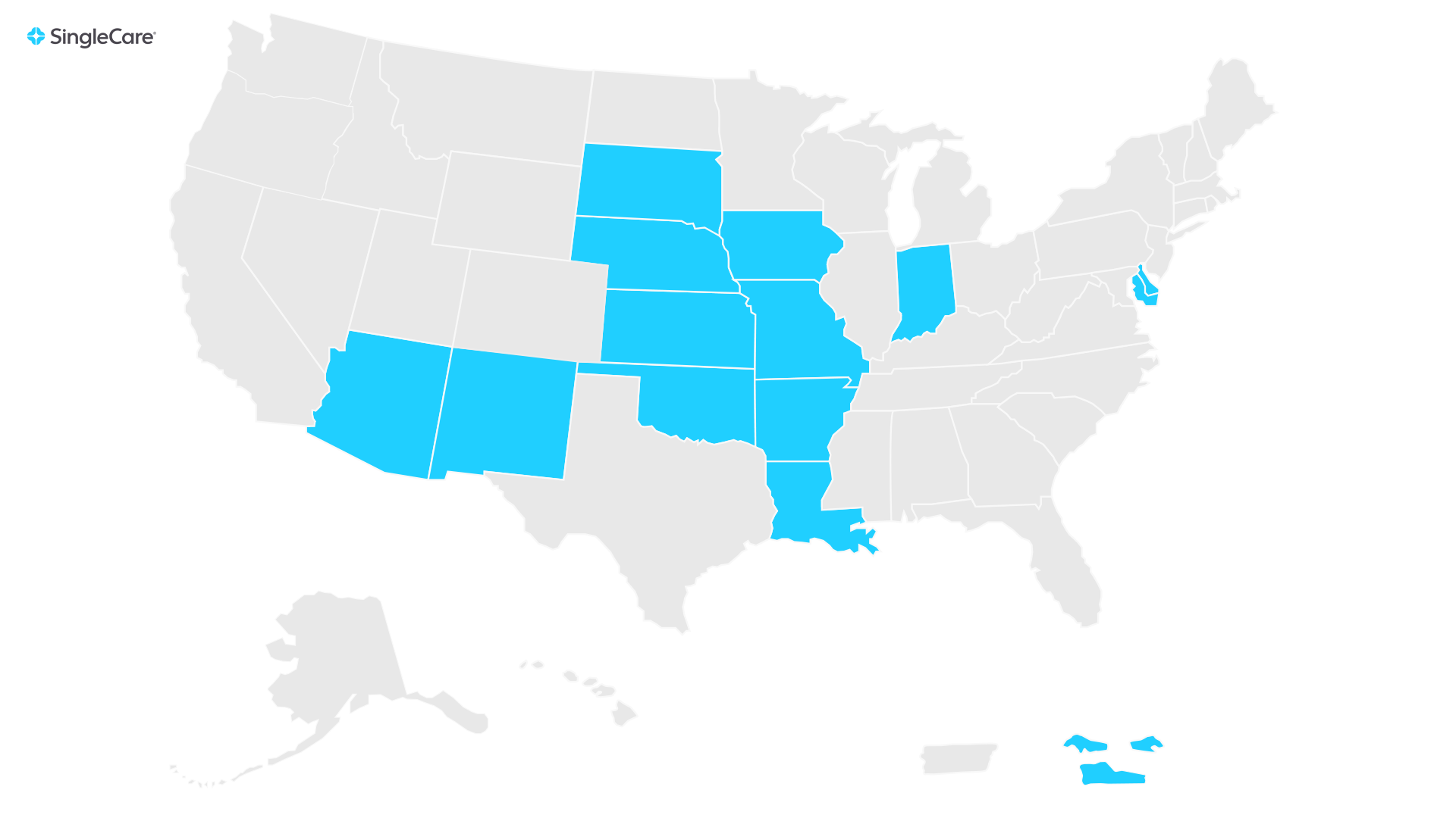 (Arkansas, Delaware, Iowa, Indiana, Kansas, Louisiana, Missouri, Mississippi, Nebraska, New Mexico, Oklahoma, South Dakota, Virgin Islands)