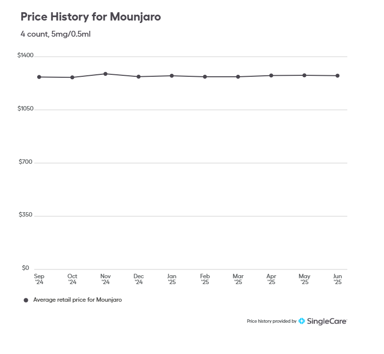 The average retail price of a one-month supply of Mounjaro is $1,493, but that’s not always what people pay. Prices fluctuate and vary by location and pharmacy. If your health insurance covers Mounjaro, you’ll pay your plan’s copay or coinsurance, not the retail price.