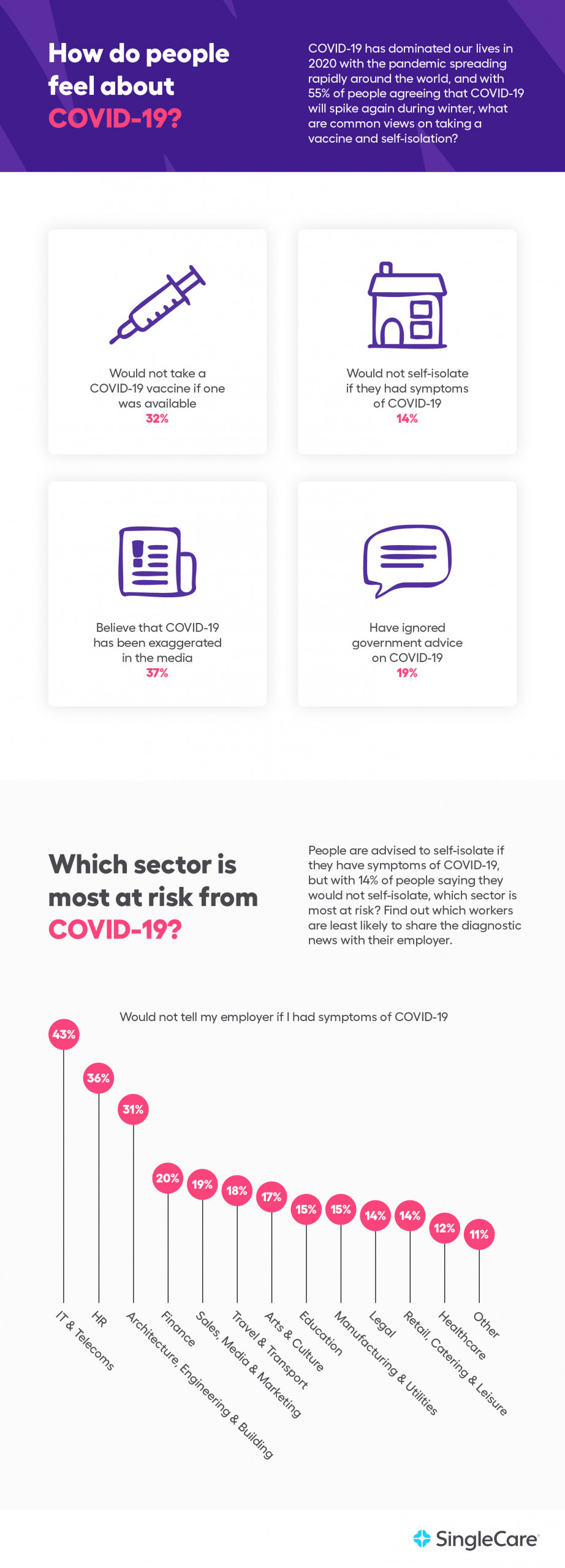 COVID-19 has been going on throughout 2020, but how do people feel about the global pandemic? Thirty-seven percent believe that COVID-19 has been exaggerated in the media while 32% would not self-isolate if they had symptoms. Take a look below to find out how people feel about the pandemic.