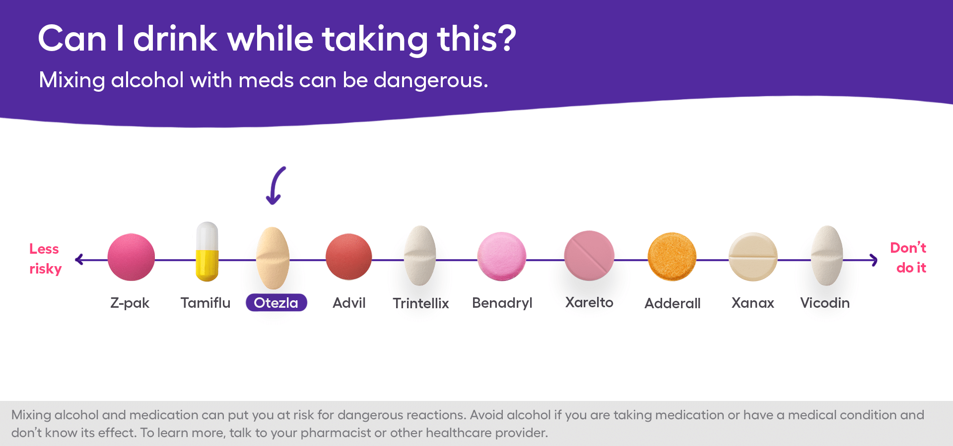 Talk to your doctor or healthcare provider if you have concerns about Otezla and alcohol use. Your doctor may tell you that drinking in moderation with Otezla carries a lower risk of side effects than if you were to drink heavily with Otezla. But, you should still use caution when combining alcohol and Otezla if your physician says it’s okay to do so.