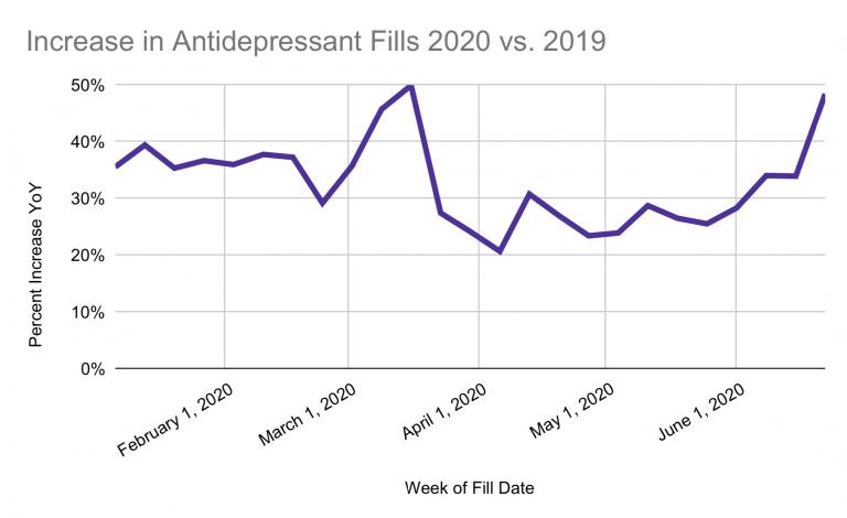 A drug group that has seen significant increases since the start of the pandemic is antidepressants. SingleCare has seen a nearly 50% increase in fills for antidepressants in the third week of June, a similar increase occurred in the third week of March when social distancing and sheltering in place began. In a recent SingleCare survey of 1,000 U.S. respondents, 59% said COVID has affected their mental health. “Between the concern over job loss, isolation, and general anxiety, this growing trend in antidepressants over the past few months may well be due to the pandemic’s impact on mental health,” says Ramzi Yacoub, Pharm.D., the chief pharmacy officer at SingleCare.