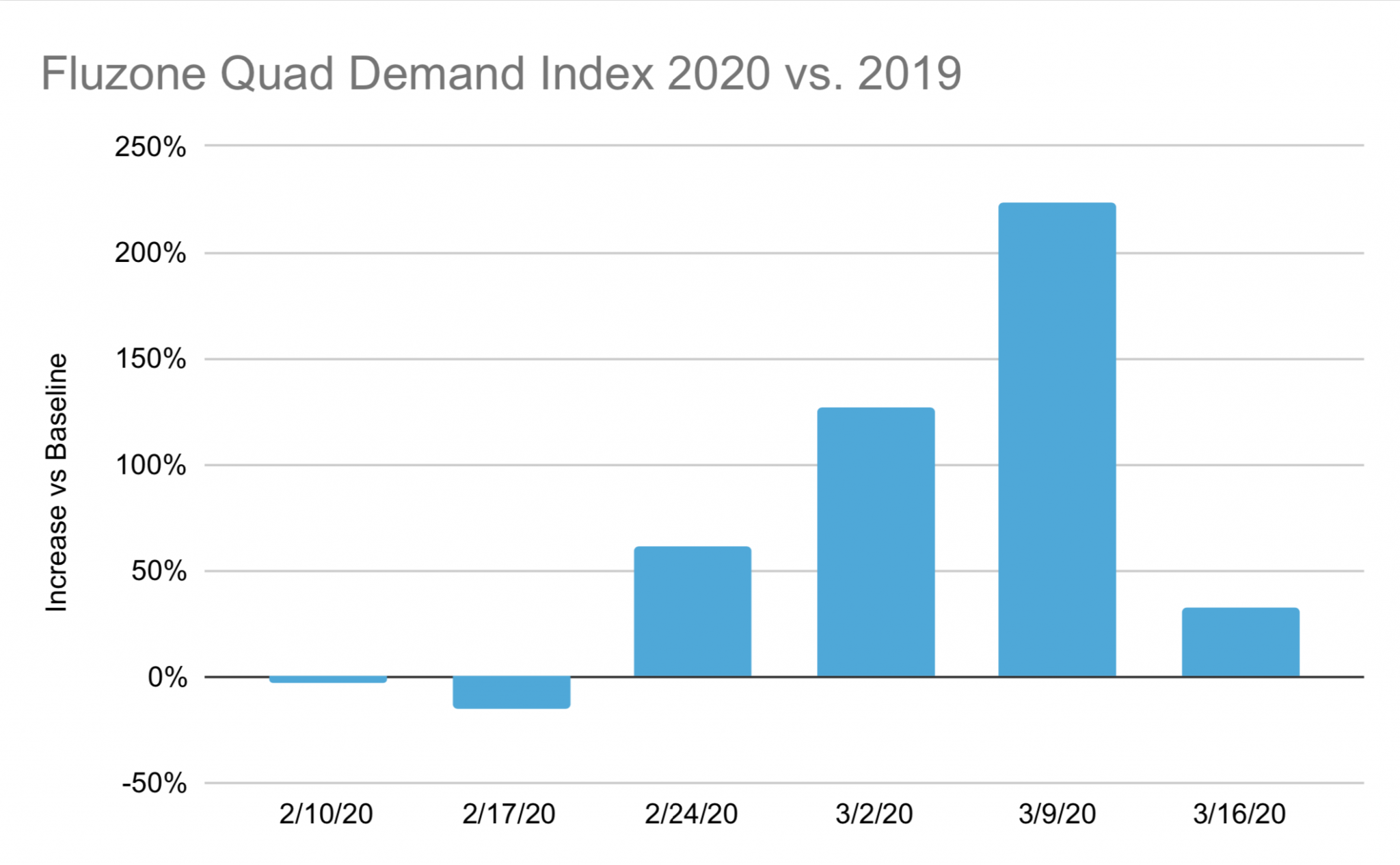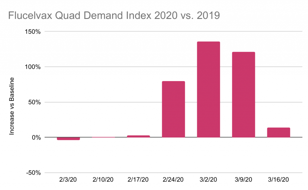 Comparing the weeks of 2/24 to 3/9 to the three weeks prior, SingleCare saw a 44% increase in demand for Flucelvax Quad and a 56% increase in Fluzone Quad.