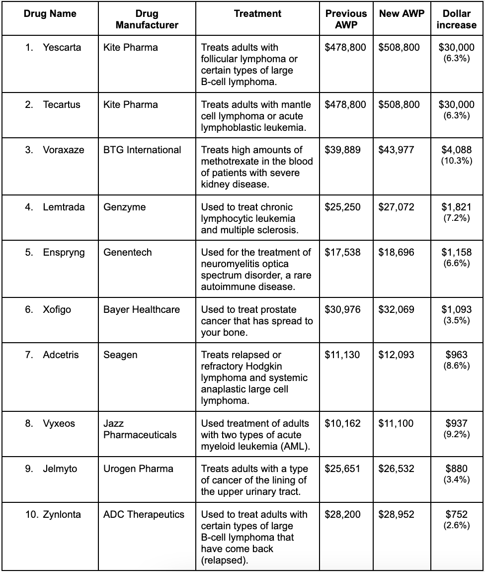 SingleCare reviewed the drugs that will see the highest dollar increase in July 2022 compared to the previous year based on the average wholesale price (AWP), set by manufacturers. While consumers never pay AWP at the pharmacy – they will either pay a funded rate through their insurance, or retail cost with the opportunity to get discounted rates through prescription savings services like SingleCare, or manufacturer discounts (copay cards or patient assistance programs) for brand drugs – this represents a baseline cost with potential trickle down cost increases to the consumer as well.