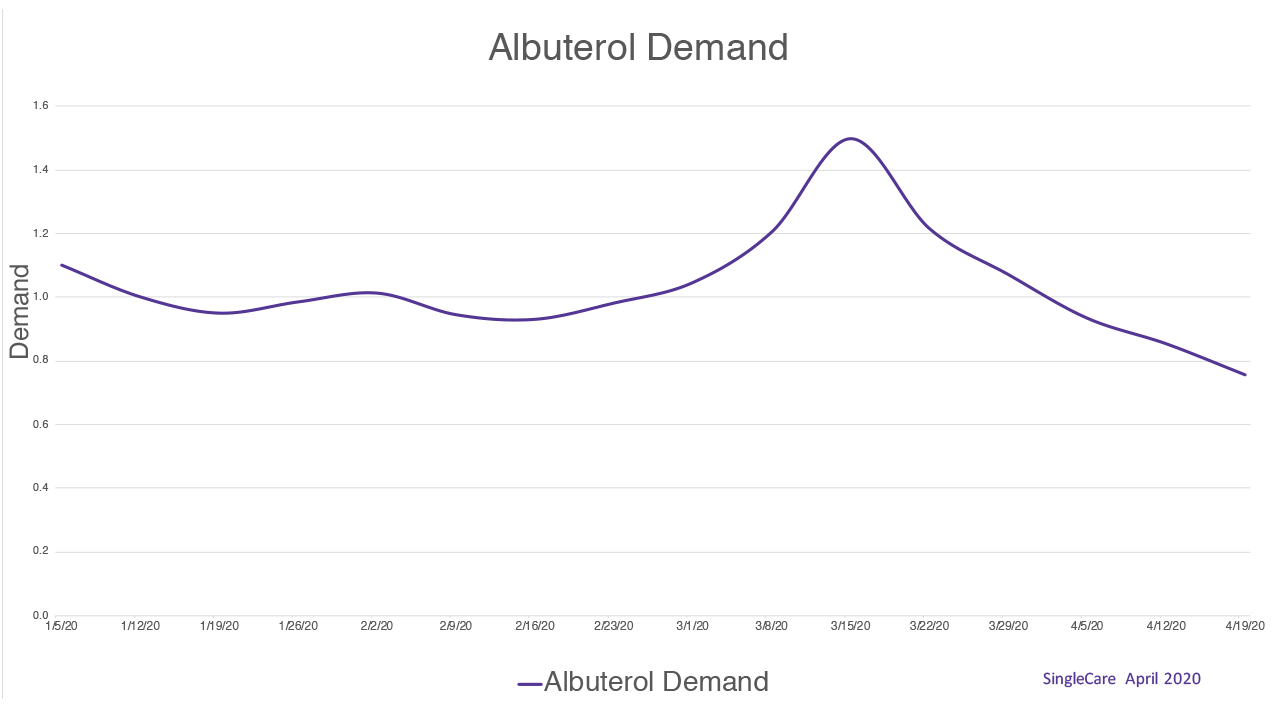 In the month of March, there was a 37% increase in demand for albuterol sulfate compared to February this year, according to SingleCare data. In the week of Mar. 15 alone, there was a 25% increase in demand for albuterol.